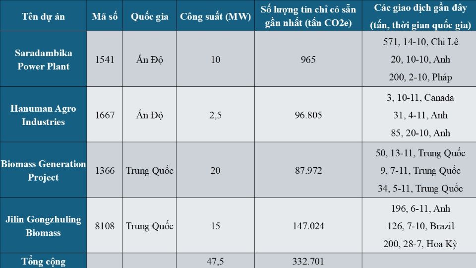(KTSG Online) – Bốn dự án điện sinh khối (biomass energy) mới nhất tại Ấn Độ và Trung Quốc, với tổng công suất 47,5 MW, hiện đang có sẵn 332.701 tấn tín chỉ carbon để quy đổi.