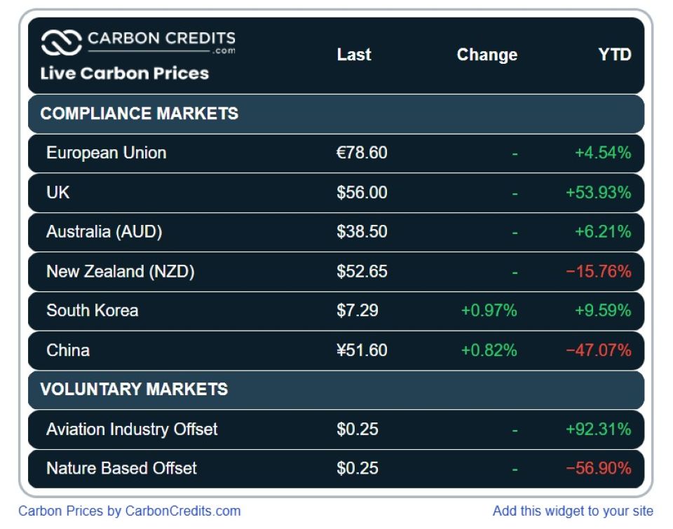 Tín chỉ carbon Úc (ACCU) đóng cửa ở mức 38,50 đô Úc, ghi nhận mức tăng nhẹ 0,7% trong phiên, giúp củng cố đà tăng trưởng 30 ngày qua, với mức tăng tổng cộng 2,9%, cho thấy sự tin tưởng vào tính bền vững của các dự án giảm phát thải Úc. Trong khi đó tín chỉ carbon New Zealand (NZU) có giá đóng cửa là 52,65 đô New Zealand, không thay đổi trong phiên. Dù ổn định trong ngày, NZU vẫn ghi nhận sự suy giảm đáng kể, -7,4%, trong 30 ngày qua, cho thấy thị trường vẫn đang giải quyết các vấn đề về nguồn cung và thay đổi chính sách gần đây.